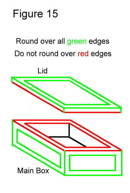 Con el marco superior adjunto y los empalmes de lijado al ras, uso el 1/4 pulgada redonda sobre algo en el router para redondear todos los bordes del frente hacia fuera excepto el borde inferior de la tapa y el borde superior de la parte superior del bastidor (ver figura 15). No te olvides de asaltos sobre todos los bordes donde los paneles van a ser. Después de haber redondeado los bordes, retirar la parte superior del marco.