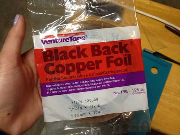 - Cobre aluminio (generalmente obtener película 7/32 pulgadas de ancho y tiene un negro detrás. El dorso negro es para que al colocar la hoja en vidrio claro, no hay cobre mostrando a través de, sin embargo esto es opcional).