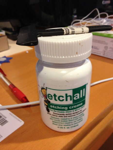 - Póngase en contacto con papel (pegajoso en un lado pero fácilmente extraíble; usado para crear una plantilla para el vidrio de la aguafuerte; esto puede comprarse en lugares como ACE Hardware)