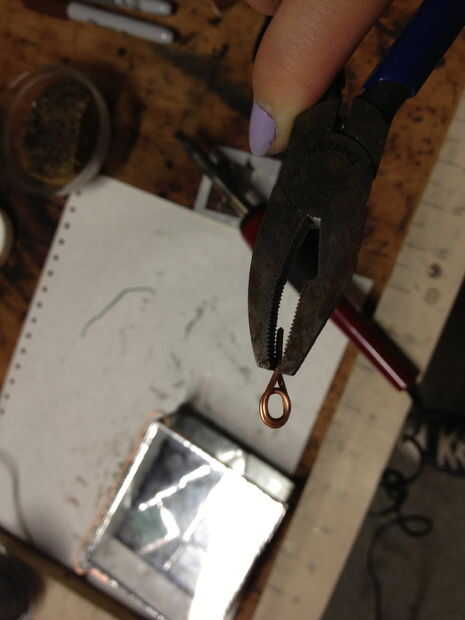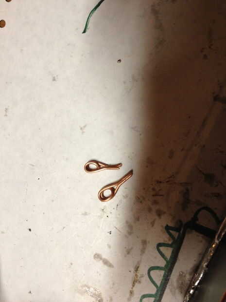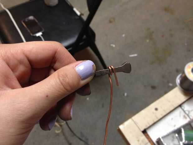 A continuación, cree los dos lazos que el alambre se alimenta a través de. Arrollar el hilo alrededor de algo, preferiblemente algo ovalada en forma como un clavo (o incluso la parte estrecha de una clave). Deja cerca de la mitad de una pulgada en un extremo y luego arrollar el hilo dos veces alrededor de la uña para crear dos bobinas. Corte el alambre por lo que hay alrededor de la mitad de una pulgada de extremo suelto (Foto 3). Una vez que este lazo, pellizque los extremos juntos en la base del lazo con unas pinzas (foto 4).