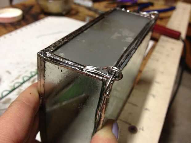 Una vez que el cable está sujeto a la tapa, alinee la tapa con la base de la caja. Coloque el extremo de cada uno de los bucles a lo largo de la esquina de la caja y soldarlos en el lugar (Foto 8). Recomiendo usar los alicates para formar los dos cables que hacen hasta el final del bucle para que mienten planos contra la esquina de la caja.