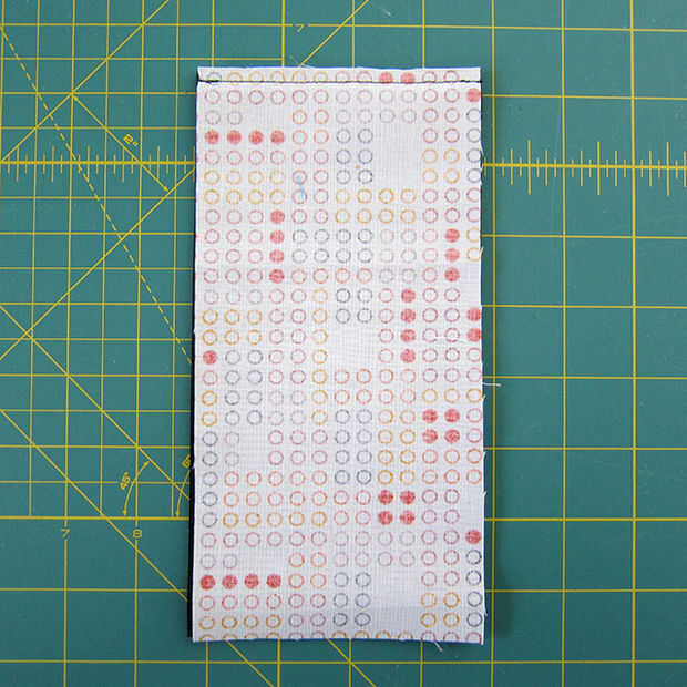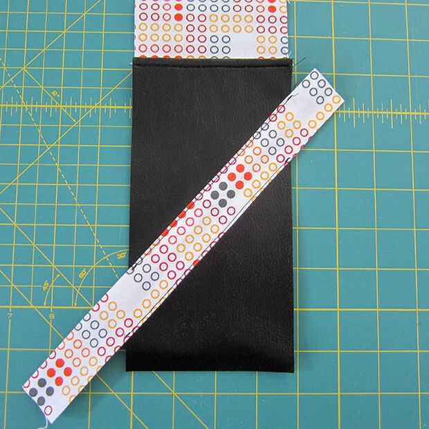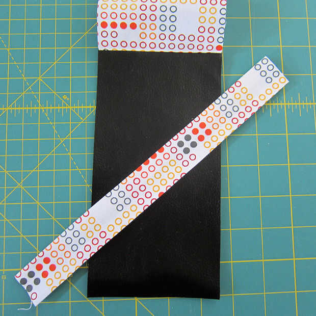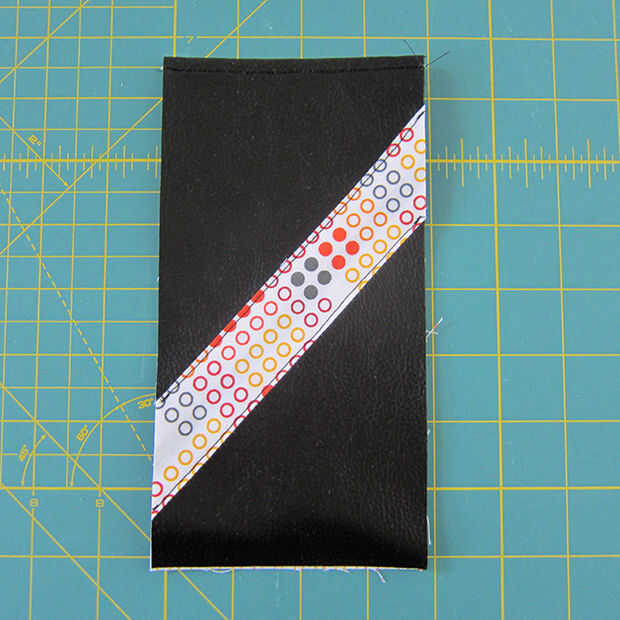 Con lados mal (de cuero de un vegano y un algodón rectángulo) la puntada a lo largo de un borde corto. Abrir las piezas y coser la tira decorativa de una diagonal. Entiendo que esta pieza de tela es demasiado larga, no obstante, quisiera hacer demasiado por lo que puedo hacer el patrón de la tela estratégicamente para conseguir el mejor efecto. Esto es más importante si el patrón es escasa o grandes. Con estos puntos no importaba tanto. Recortar a la tela sobrante de los bordes. Piezas de doblez retiran juntos (derecho contra derecho) y coser a lo largo de la parte superior de la costura.
