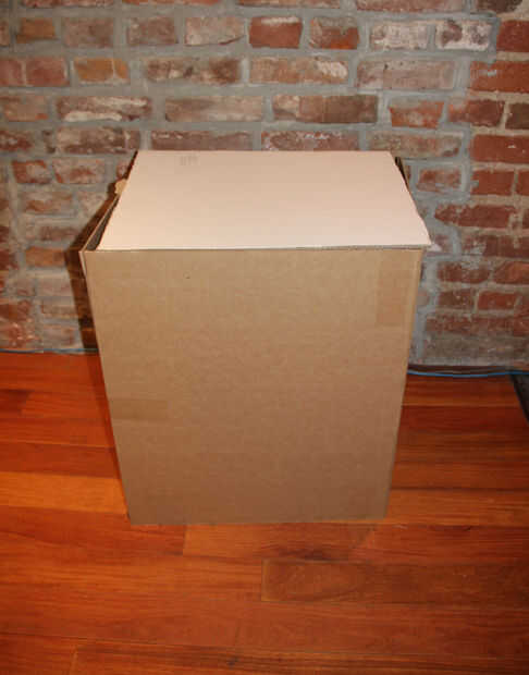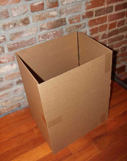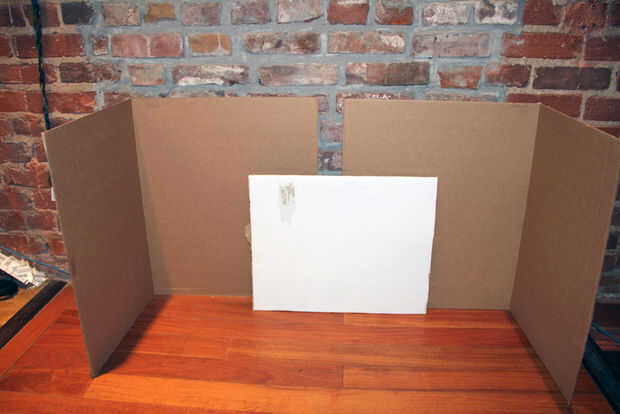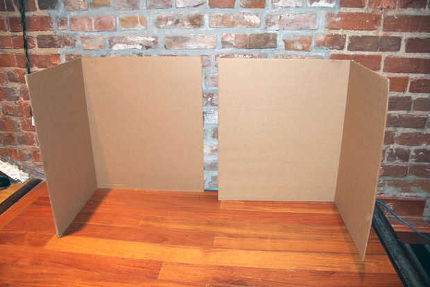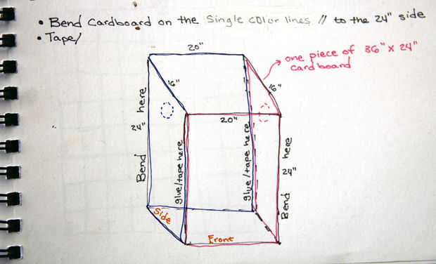 - Con los dos 36 "x 24" piezas dobladas en un ángulo de 90 grados, llevarlos juntos para formar una caja. Fije los lados que se toquen con cinta para mantenerlos temporalmente en el lugar.