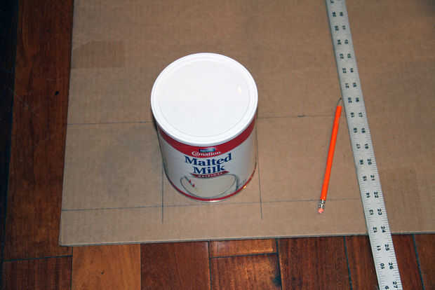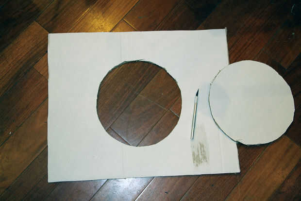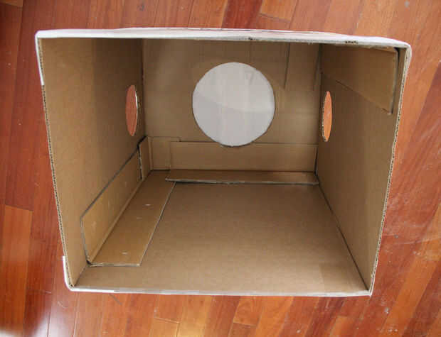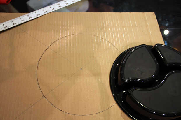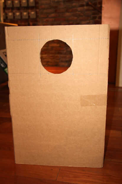 - Corte un orificio de diámetro de 5.25" en el centro de las piezas laterales (16" lado de la cartulina doblada) que es aprox. 2,25 pulgadas desde la parte superior.