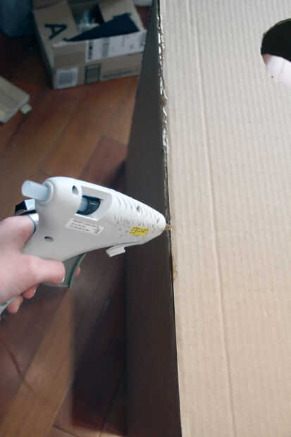 - Pegamento caliente los lados con cinta juntos (quitar la cinta al hacer esto). Usar una pistola de pegamento, pegamento hacia abajo de los lados en el interior y fuera de la caja.
