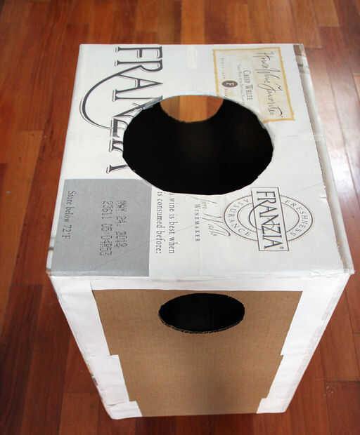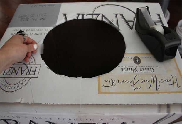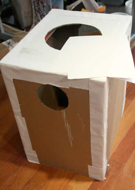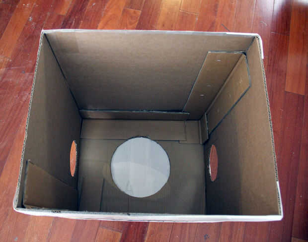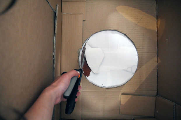 - Desde el interior de la caja cortar los agujeros del brazo y la pierna usando tijeras o un cuchillo del exacto.