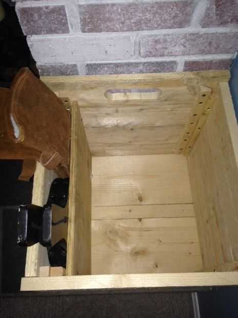 Medí el espacio donde la caja se sentaría y decidido en la altura. Opté por usar una pieza de 16 pies de pino de 1 x 6 de Lowe. Usando mis ingletes Sierra que corté las piezas a la longitud que necesitaba. Entonces decidí que quería 2 lados de la caja para tener 4 listones y los otros 2 lados con listones de 6. Muelen el 1 x 6 en 4 y 6 piezas de igual anchura. A continuación, presenta todas las piezas para cada lado y Unido tiras de desecho de la madera utilizando tornillos para formar 4 paneles. También encontró un pedazo de madera contrachapada y cortado a la medida para hacer el divisor para el espacio de guante/fuelle. Entonces llevé a los lados dos 4 panel al taladro donde perforado 5 agujeros usando una broca de fostner para cortar los agujeros del mango. Picaban el exceso usando un cincel y un mazo.