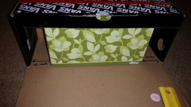 Vas a centro de la caja del tejido en tu caja de zapato, real simplemente medir la caja del tejido y asegúrese de que todo se alinea para el taladro. Recuerda voltear la caja boca abajo y el orificio para que manera parece correcta al final.