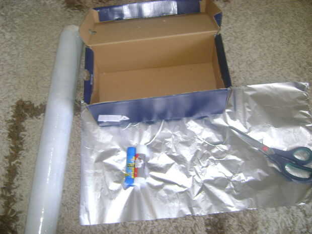 hice este horno solar de la nada, pero:una caja de zapatos (con la tapa puesta, no removavel),una camisa de invierno vieja,una bolsa de plástico,papel negro,dos lápices,y papel de aluminio.Paso 1: la tapa Corte la tapa como la imagen.Paso 2: el "cris