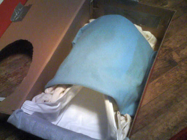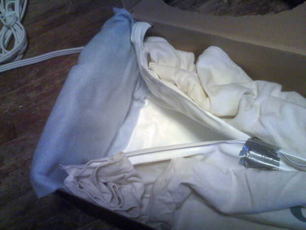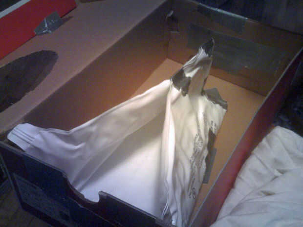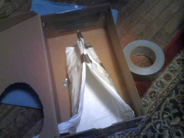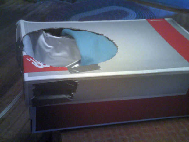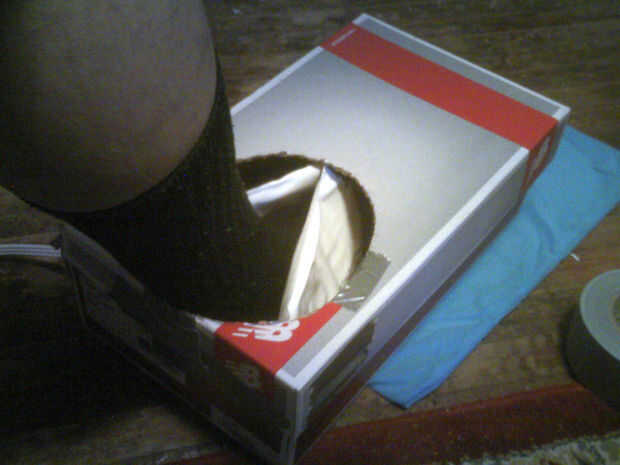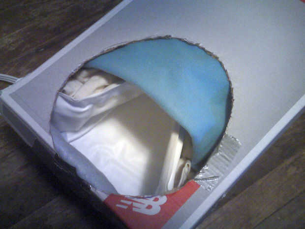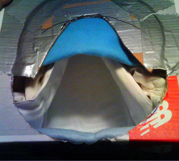 Corté un agujero en la parte superior de cada caja de zapatos para mis pies entrar. Luego abrir cada caja de zapatos y coloca una almohadilla térmica en cada caja de zapatos. Le pongo mis pies en sujetar las almohadillas en su lugar y utilizadas pequeños trozos de cinta para obtener que se ajustan a cada pie. Corte pequeñas ranuras para las cuerdas y utiliza poco más de cinta para les que se mueva. Rellena una camiseta vieja en cada caja para hacer las almohadillas se ajustan más, aunque esto no es necesario. Puse un trozo de fieltro en el interior tacón y una lengua, pero funciona sin todo eso, así que terminé tomando hacia fuera.