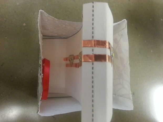 3. cuando la parte superior de la caja se presiona hacia abajo, la batería hace contacto con la línea positiva y enciende el LED y la caja.