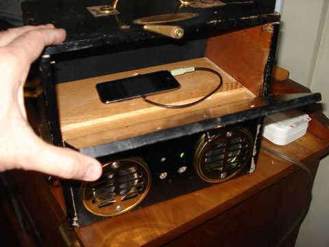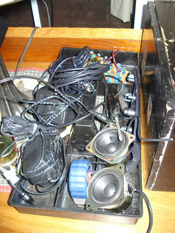 Los oradores fueron desmontados de 2 pares de bocinas para computadoras Dell, estoy usando ambos amplificadores mini de una fuente de alimentación sencilla (el transformador original de Dell). Más tarde agregué mi cargador de teléfono celular debajo de la superficie como un bono adicional. Gracias por ver.