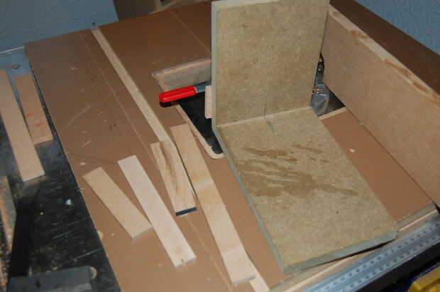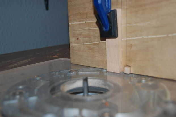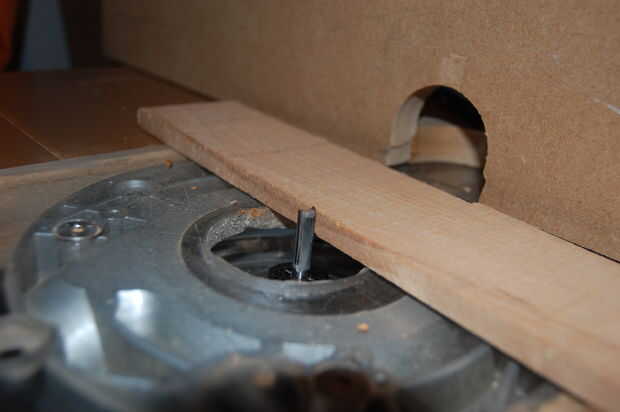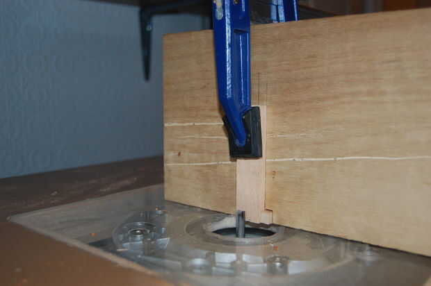 Esta vez he utilizado el primer método con tiras ancho 21mm (3 * diámetro de router). Sólo tienes que hacer que la madera esté bien sujeta con una estrecha franja... puede sin embargo hacer una más larga que la necesaria articulación de los dedos y cortar hacia abajo según sea necesario.
