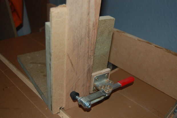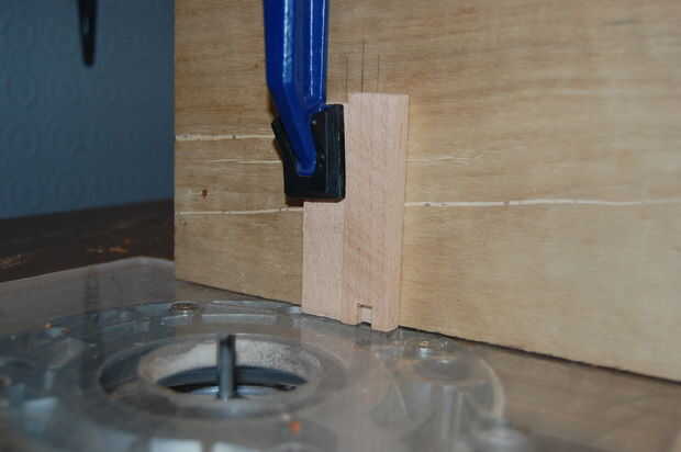 La segunda plantilla que he estado usando durante un par de años ahora también incluye una plantilla en forma de L. A un lado de la plantilla hay una tira vertical precisamente de la madera y el otro lado alberga una abrazadera de palanca. Usted también necesitará un número de tiras de madera que son el mismo ancho que la broca de fresadora. Esto puede hacerse con una cepilladora/regruesadora o un plano, tienen que ser bastante precisa, aunque como si fueran simplemente una fracción demasiado grande el error pronto se montará encima de. Al cortar las articulaciones puede al lado de la madera a la pieza vertical de referencia y fijarlo con la abrazadera hacia abajo con la abrazadera de palanca. Defina una cerca en la mesa de fresadora (sólo un poco de madera afianzada con abrazadera) y la broca de fresadora para cortar en el borde de la madera. Una vez que el corte Coloque dos trozos de tiras de la madera entre la plantilla y la guía para moverlo todo a través de dos router bit anchuras. Luego simplemente seguir añadiendo dos tiras a la vez hasta que ha llegado al otro lado de la articulación. Me gusta este método pero restringir la anchura de la articulación que se puede hacer (máxima distancia entre la vertical de la tira y la palanca de la abrazadera).
