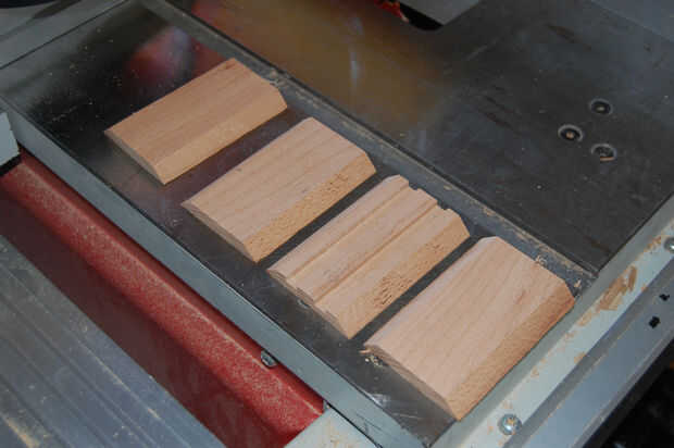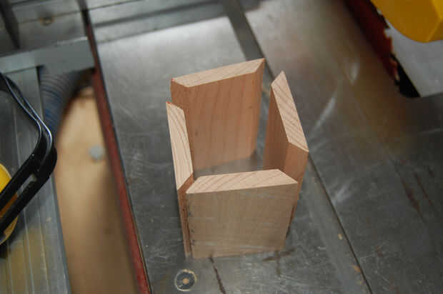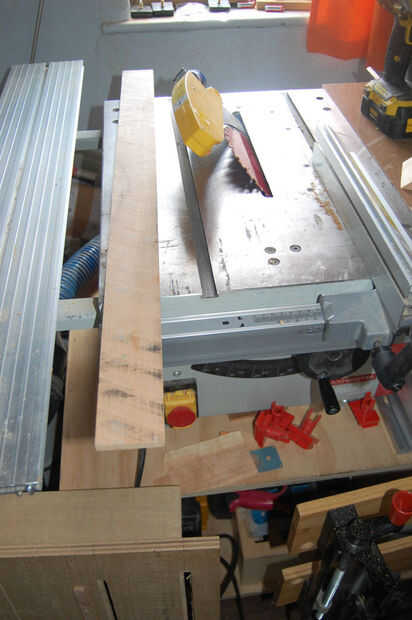 Empecé por el cepillado y regruesado mis tablones. Hice una tabla alrededor de 10mm de espesor, para la caja externa y otro alrededor de 7mm de espesor para la caja interna. Una vez cepillada arrancó el tablón para mi caja externa a alrededor de 50mm entonces mi sierra de mesa a 45 grados y corte los filetes a ambos lados de la tabla. Entonces corté cuatro secciones de este tablón para hacer los lados de mis cajas.