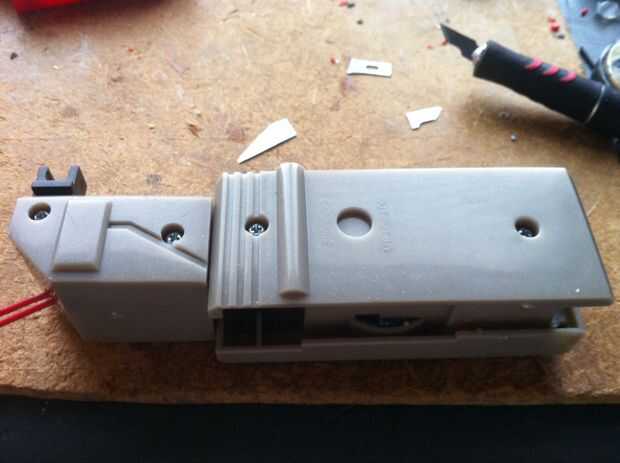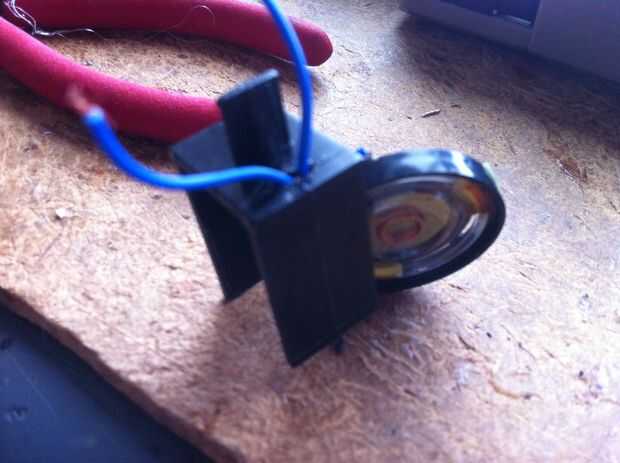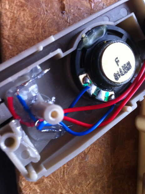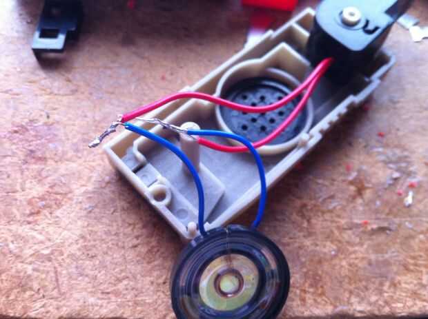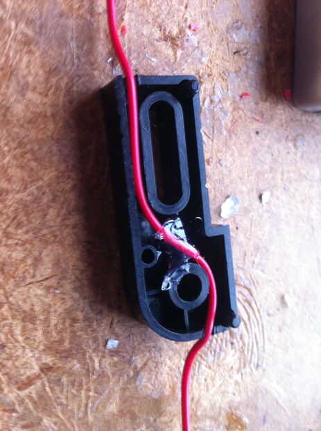 Luego, empiezas a roscar el alambre a través de la pierna. Se inicia en la articulación de la rodilla, poniendo un alambre dentro de cada mitad con cerca de 3 en pegarse hacia fuera de cada extremo, asegurándola con un poco de pegamento caliente. Después de que el pegamento se haya enfriado, juntar las dos mitades y deslice en el interior clicker. A continuación, broche de presión en las dos mitades de los muslos superiores, enhebrar el alambre hacia fuera de las ranuras. Ahora soldar los dos cables al altavoz y, usando el pegamento, pegamento del altavoz a la pierna. Ahora, pegue el empalme de la soldadura alrededor del poste, asegurándose de que cuando la articulación de la rodilla se extiende completamente los cables completamente no estirados. Broche de presión en la parte posterior de la pierna inferior y poner que los tornillos de nuevo. Conecte los cables del altavoz a la electrónica y asegúrese de que el altavoz está trabajando. Si es no, ábralo hacia arriba y buscar cruzado o cortar alambres y malos empalmes de la soldadura.