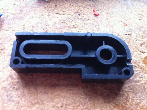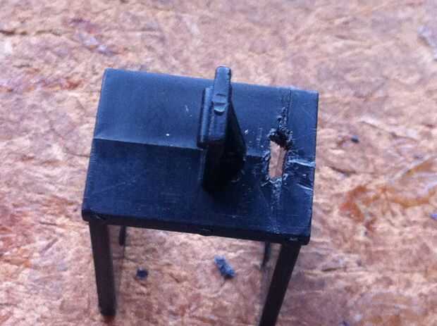 En primer lugar, corte las muescas que el cable del altavoz para llegar a la pieza del pecho. al cortar estas muescas, asegúrese de que como corta eso dos cables puede caber a través de ellos. las muescas primera corta es en la articulación de rodilla, cincel como especificados en la foto. a continuación recorte muescas del muslo superior, también como se especifica en la foto. Por último, pero no menos importante, recorte un orificio lo suficientemente grande para dos cables se deslice a través en el interior clicker.