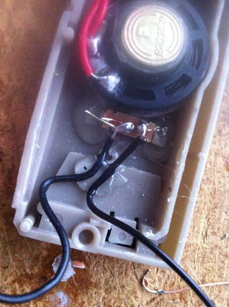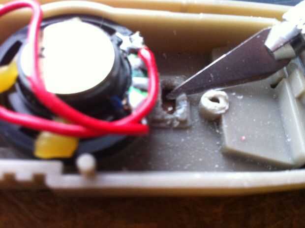 A continuación, cortar el poste de tornillo. Esto es necesario para el interruptor y las baterías que van a caber en esa pierna. Agujero hacia fuera el interruptor falso que fue moldeado en. Una vez que tenga un agujero lo suficientemente grande, pegue el interruptor en su lugar. Tomar el cable negativo de la batería y soldar al interruptor y hacer lo mismo con una de extra del cable que se rosca aunque. El positivo de la batería estrecha en el cable positivo adicional de la soldadura. Ahora cerca de la pierna y cables hasta la placa de circuito. Al hacer esto Asegúrese de que tiene los cables de batería correctos y no mezclados para arriba con el altavoz conduce, como esto puede freír el chip de control.