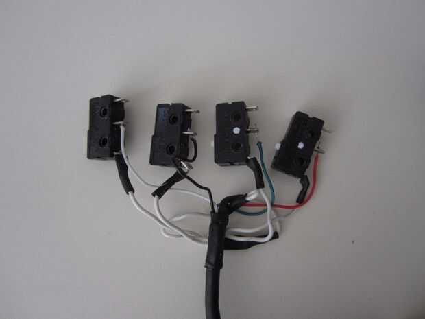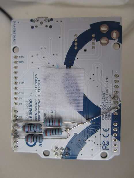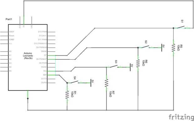 La electrónica es muy sencilla, consta de cuatro interruptores micro, resistentes a la cuatro de 10 k, un metro o tan del alambre de la base seis. Cuando se hace clic en uno de los microinterruptores enviará 5 V a un pin digital de Arduino Leonardo. Cuando se suelta que el interruptor de la resistencia de 10 k está ahí para que pin seguro para digital vuelve a tierra.