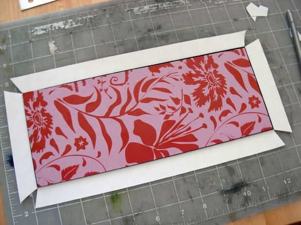 Coloque la pieza de la caja sobre el papel decorativo. Corte un pedazo de papel más grande en todos los lados que la pieza de caja de 1/2". Traza el exterior de la pieza de la caja con el lápiz. Spray el unpapered lateral de la caja de piezas con el pegamento de spray y aplica al punto marcado hacia fuera en la más grande pieza de papel decorativo. Pulir con el hueso plegable para asegurar un cierre suave. Con el cuchillo cortar cuñas de 40 grados en los bordes que sobresalen del papel a las esquinas de la pieza de la caja.