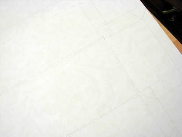 Con el lápiz, trace una línea alrededor de las piezas de la caja y una línea de 1/2" desde el borde exterior de las piezas. En las esquinas, colocar marcas de ángulo como se muestra en la segunda foto.