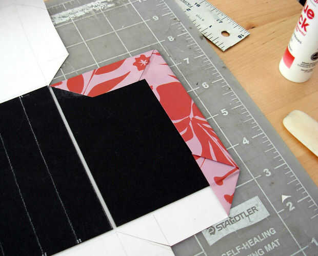 A partir de la esquina de lado derecho, colocar pegamento de la barra en el tablero de papel y la ilustración. Luego doblar la esquina a lo largo de sus anteriores marcas angulares hasta han creado un ángulo de 45 grados en la parte superior y lateral del papel. A continuación, usar más pegamento y doble hacia abajo el borde superior y borde lateral. Esto es como envolver un regalo. Repita hasta que ambos lados están envueltos completamente como se muestra.