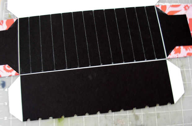 Voltear el papel y el cartón a la parte inferior. Cuidadosamente corte el papel sobrante de solamente el borde de la pieza con las muescas, dejando las alas a los lados. Utilizar la perforadora para cortar el papel de dentro de las muescas. No corte el papel de los lados del.
