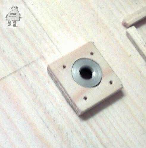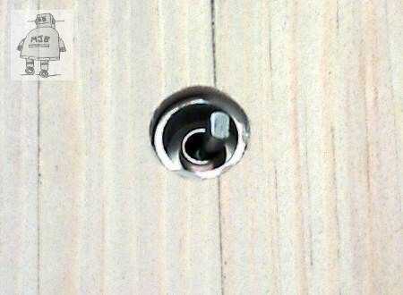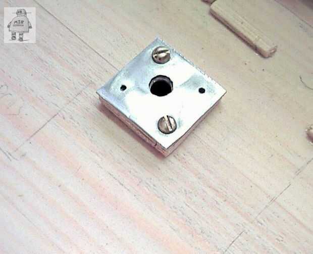 Un orificio mm aproximadamente 10 fue perforado a través de la base. Otro orificio correspondiente fue puesto en una pieza de embalaje de madera, para sujetar la cubierta/cubierta de metal del interruptor. La cubierta debe mentir al ras en el interior y empotrar un poco fuera.