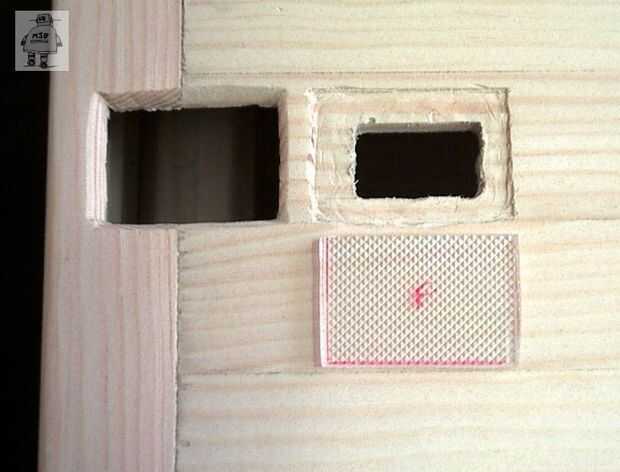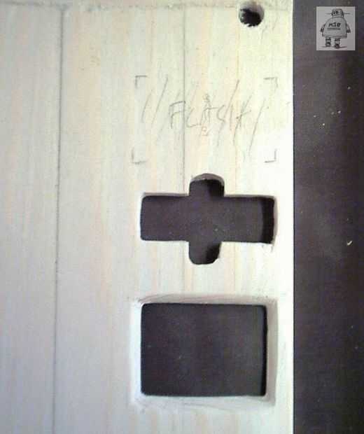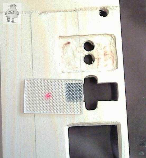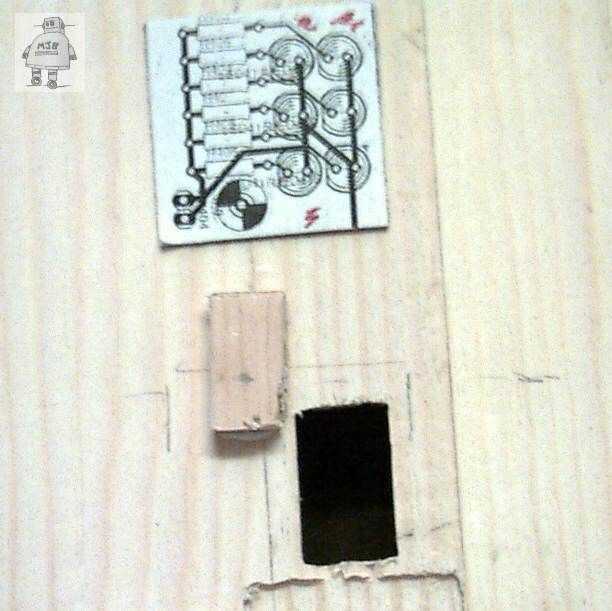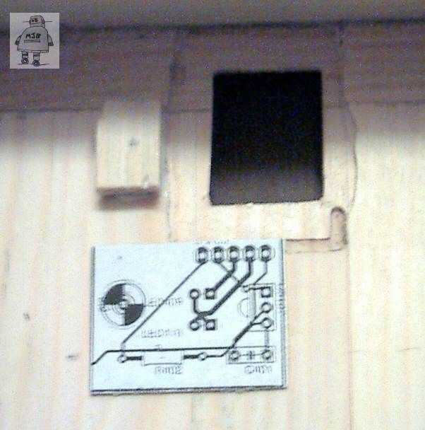 Para ayudar con el pequeño PCB en el lugar de montaje, unos pequeños bloques de madera estaban pegados por la parte posterior flash (LED 2) módulo de LIRC (IR Tx/Rx) y parte delantera flash (6 LED). Esto le dará más gruesa madera poner tornillos pequeños en.