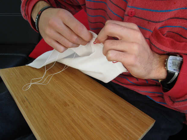 Coser un lazo en un pequeño rectángulo. Utilizar las puntadas corrrect.