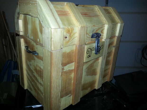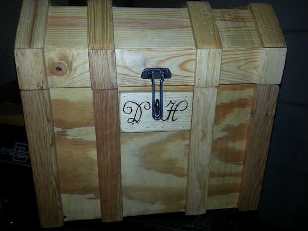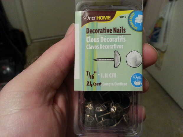 • Una vez que la madera estaba manchada me pegué y tachuelas en el pecho con 6 Clavos brad con mi pistola de clavos del alfilerillo. Una vez que terminó me cansara del pecho. Todavía estoy tratando de decidir si debo utilizar los clavos decorativos que encontré para vestir o no. Tipo de me gusta la forma que se ve ahora. Apenas pueda dar estos clavos decorativos a mi amigo y si quiere en él puede hacerlo. Si no tal vez podemos utilizarlos en un proyecto para otra persona.
