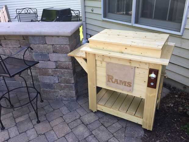 Me doy cuenta que esto no es un perfecto paso a paso, pero ojalá puedan ver de que se puede hacer con las herramientas mínimas. Usé una tronzadora, taladro y máquina de clavar clavitos. Acabado con dos capas de pintura para barcos por lo que podría dejarlo fuera. Tenía un amigo fontanero montar un grifo en el exterior de la caja del refrigerador hacia el desagüe existente más fresco. Tomó un montón de trabajo y retoques pero creo que salió bien.