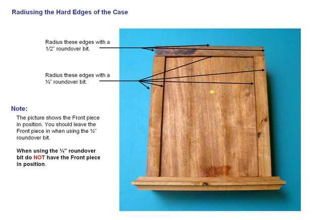 Quitar el frontal y el radio interior frontal borde de cada lado y la parte inferior de la parte superior con un roundover 1/4 de pulgada de bits. Tenga cuidado de no hacer hincapié en la parte superior.