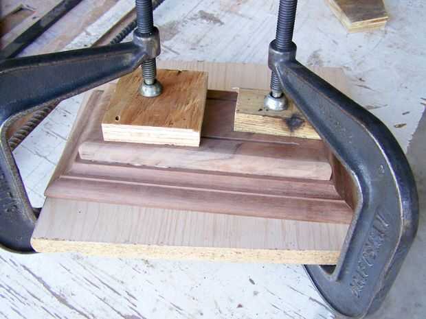 La primera foto muestra la base y la pieza inferior (a la que monta el movimiento del reloj) con abrazadera juntos para que el pegamento se seque. Antes de que estaba totalmente seco el pegamento he quitado las pinzas y había raspado lejos cola marcas con un formón afilado.
