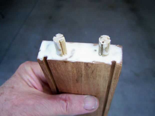La segunda foto muestra uno de los lados con pegamento aplicado y con ganas de ser empujado en su lugar. Quité a un lado en un momento y un pasador en un momento. Mis tacos no son uniformes en longitud y los agujeros no son simétricos. Preparar cada espiga uno a la vez ayuda a asegurar las partes volver junto derecho donde pertenecen. Cortar ranuras de pegamento en los tacos de mano con una prensa y una sierra de dientes finos. Quitar pegamento de las piezas antes de que ha endurecido.