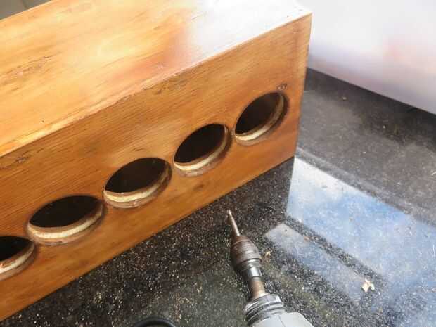 Usé un taladro de mano eléctrico normal para abrir los agujeros. Usé una broca plana madera (25 mm) para abrir los agujeros. Tuve suerte, porque la broca no hicieron daño a la superficie de la madera.