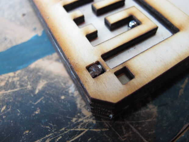 Después con la bola pegada al lado del imán, capa 6 en la parte superior y compruebe que puede liberar la bola del imán con una sacudida. Si no, probar con el imán hacia fuera un poco con algunos materiales de desecho del embalaje.
