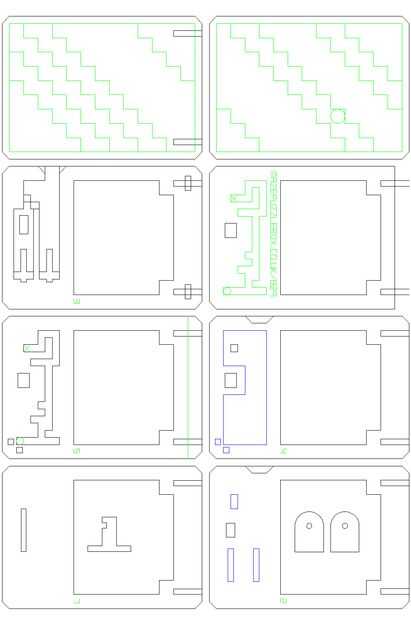 El archivo de CAD final tiene 4 colores, blanco y gris para los cortes, verdes para los patrones y azul para las piezas grabadas. Los valores que utiliza un cortador de 30W son:
