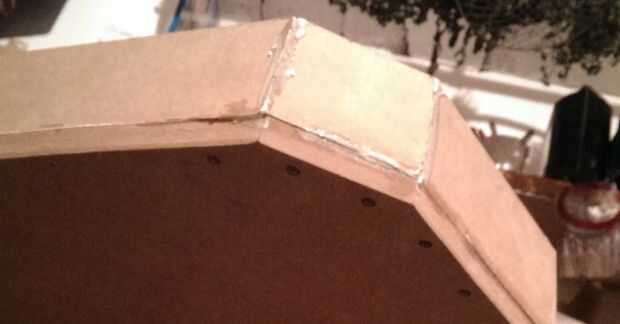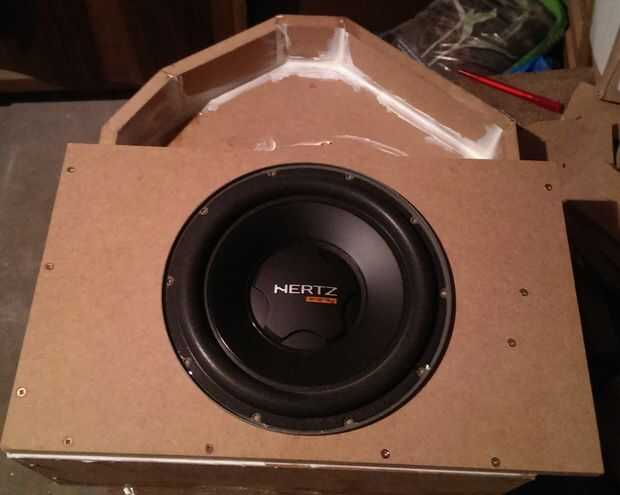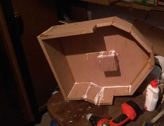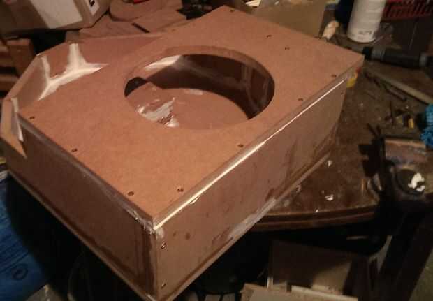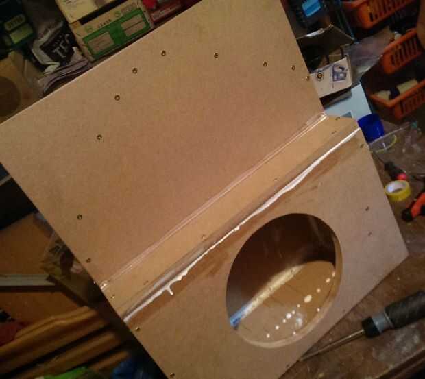 No te olvides de cortar el círculo para el chasis del altavoz de subgraves. Una vez que el pegamento secado, dio la caja un último acabado sellando los bordes desde el interior y el exterior y finalmente perforó un agujero para el cable del subwoofer en la parte superior.