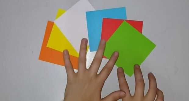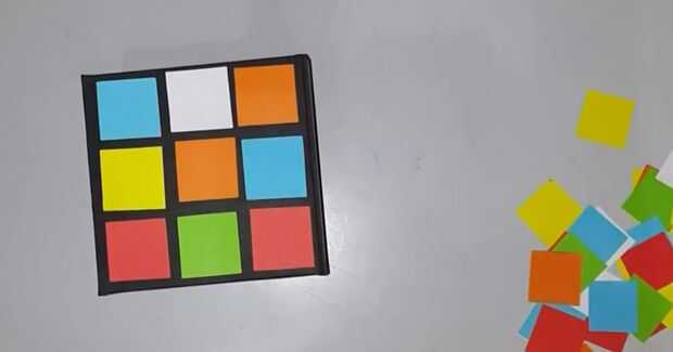 Cortar el papel de color en cuadrados de 9x9cm y luego cortar cada cuadrado en 9 cuadrados iguales.
