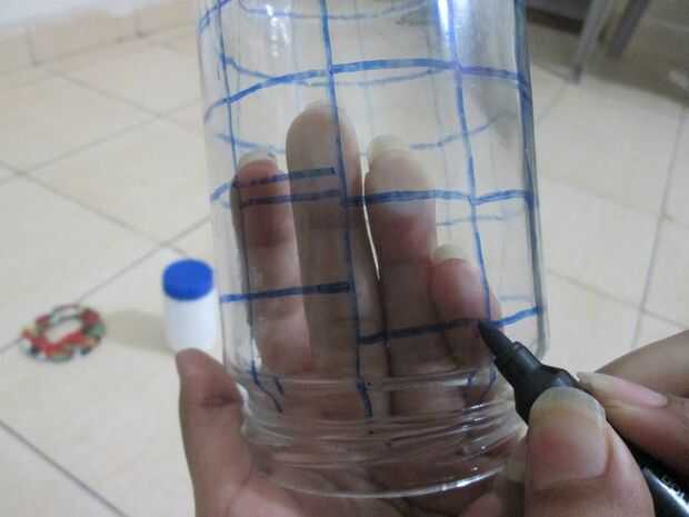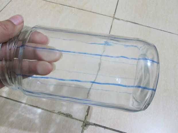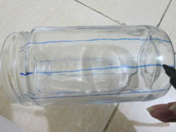 En primer lugar, tomar un tarro de masón y con ayuda del marcador dibujar líneas rectas en él