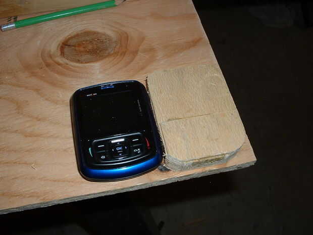 Comparando mi teléfono a la madera que tenía, corte un bloque de la madera contrachapada que era aproximadamente el mismo tamaño que el teléfono. Vi que la madera era más delgada que mi teléfono, así que corte el mismo bloque de forma de algunos madera balsa delgada que tenía que mentir sobre.