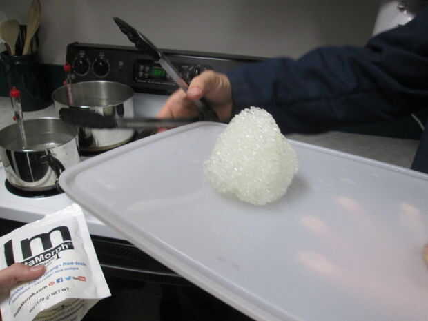 El siguiente paso es tomar el instamorph fuera del agua y dejar enfriar. Cuando se toma hacia fuera, sería prudente que usa algo de plástico para poner el instamorph caliente en que nada quedaría para el material. También me gustaría recomendar dejar que se enfríe durante al menos 10 segundos, pues el material es muy caliente. Usted puede notar como empieza a moldear el material que es muy maleable y elástico... también hinchable. (: