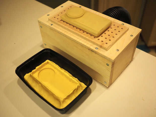 Un molde muy exacto del teléfono celular fue hecho con masilla polivinilsiloxano, usado para tomar impresiones orales para la fabricación de prótesis dentales. También pueden utilizar una variedad de productos de caucho líquido de uretano (www.smooth-on.com) disponibles ampliamente en las tiendas de Artes y oficios. Un modelo de escayola se hizo de este molde y se colocó en una pila corta de monedas para elevar sobre el vacío perforado formando la caja.