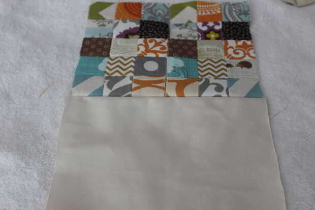 Después de doblar el patchwork sobre la tela interior para que el patrón esté orientada hacia afuera, dóblalo por la mitad, para que el mosaico está en el interior.
