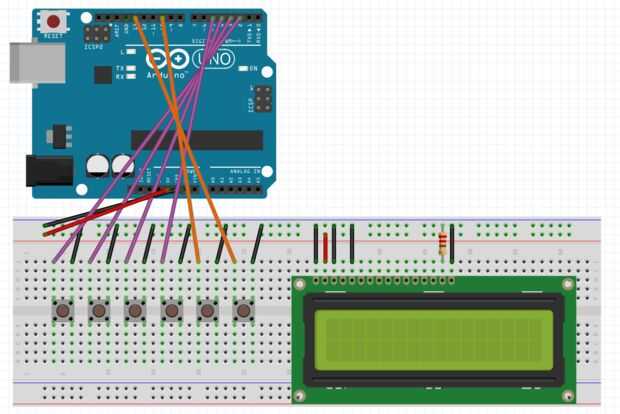 Aquí el siguiente paso sería conectar la pantalla LCD. Enviar un cable de 5V de la ONU al carril positivo en la placa, conecte las clavijas al suelo y rieles de alimentación como se muestra.