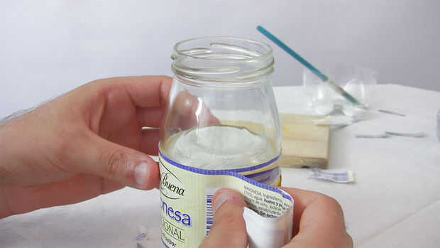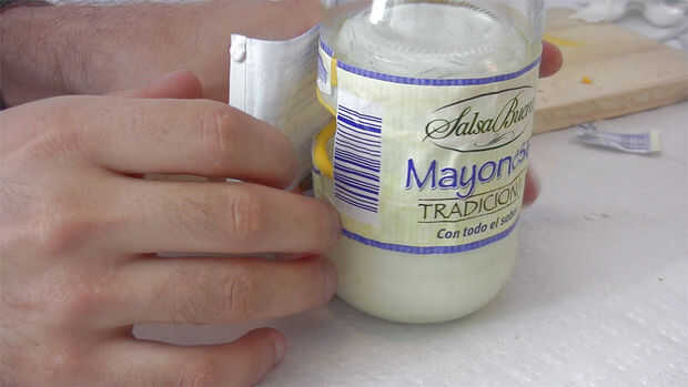 No ponemos pegamento en la parte donde está el agujero. Utilizamos amurado a blanco para que la etiqueta se pega a la jarra.