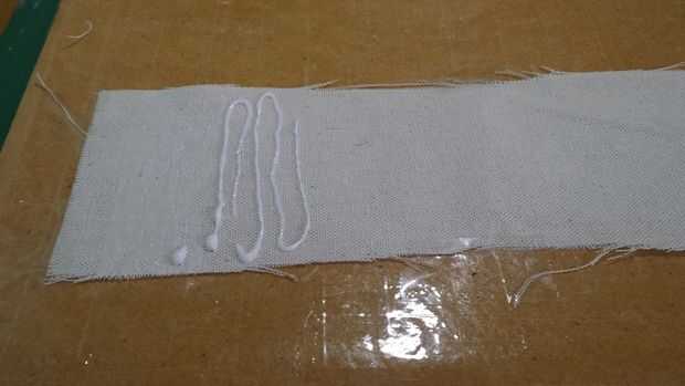 Tome un pedazo de lienzo y pincel cola blanca pura en toda la superficie. Deje que se seque, luego repita el proceso. Esta pieza de tela aquí está impregnada con 6 capas de pegamento (3 en el frente, 3 en la parte posterior). Esto se asegurará de que al cortarlo, los hilos de la tela nunca se desintegraría al cortarlo y usarlo como una bisagra.