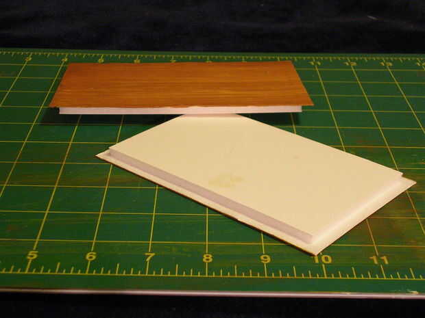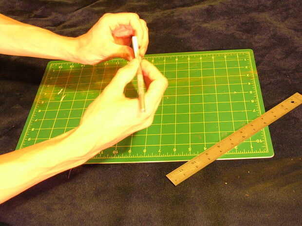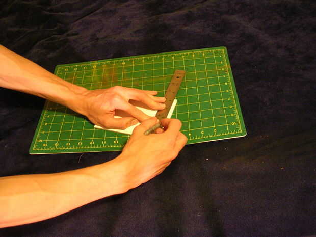 Tome ambos A6 "sección y coloque el lado pintado hacia abajo sobre una estera de corte artesanal. Con cuidado corte una tira de 5/16 de pulgada de ambos extremos de 4", sólo cortando no pintó el forro y la espuma sí mismo (no corte a través de la parte pintada de la Junta). Luego corta a través de la espuma sí mismo. Esto debe dejo con 2 muescas en cada aburrido como se muestra en la imagen de abajo.