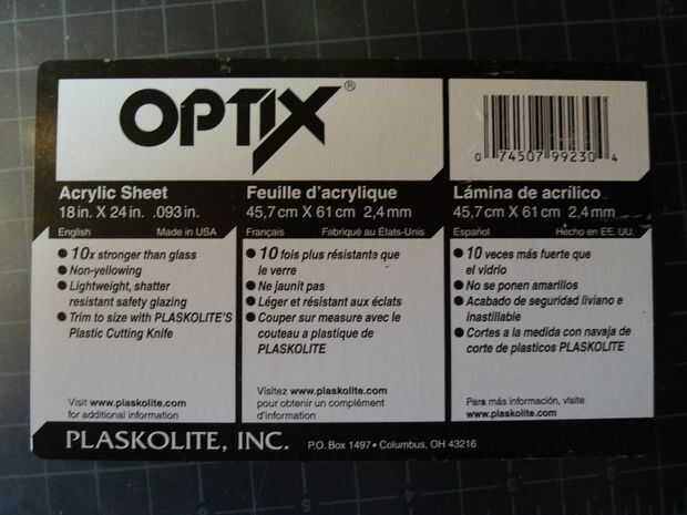 5 hojas de hoja del acrílico de "Optix del", 1/8" de espesor, 18 X 24 pulgadas - $10 en Home Depot - considere una hoja adicional para la práctica de corte y perforación. Usted podría comprar más gruesa (1/4") de la hoja, pero es más caro y probablemente mucho más difícil de cortar con precisión.